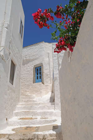 Traditional cycladitic alley with a narrow street, whitewashed houses and a blooming bougainvillea in Lagada, Amorgos Greece