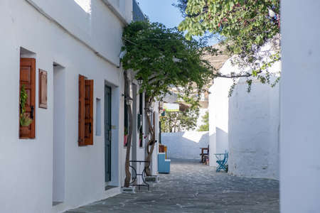 Beautiful Lefkes traditional greek village in Paros island. Charming coffe bars in narrow streets. Cyclades , Greece