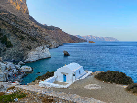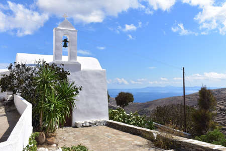 A charming small chapel in the old town of the beautiful Greek island of Sikinos. A summers day with blue skies. View to the island of Santorini in the distance.