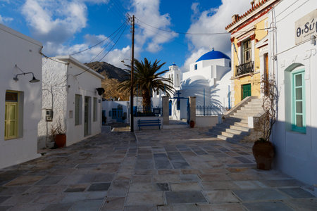 Traditional Cycladitic alley with a narrow street whitewashed houses and a church in Chora kythnos, cyclades, Greece.