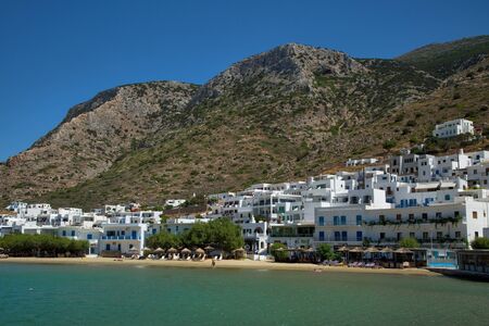 Beautiful morning of Kamares village with turquoise water, white houses and mountain in Sifnos In Greece