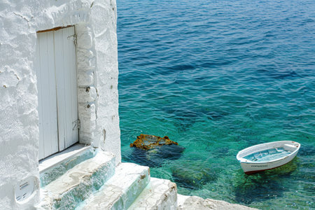 A white boat is floating in the ocean near a white building. The water is clear and calm, and the boat is the only thing visible in the scene