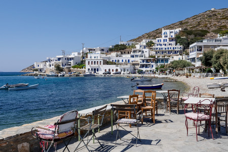 Tables with chairs on coastal promenade in Livadi. Serifos island, Greece