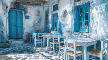 Whitewashed walls and blue shutters adorn a typical Greek island cafe exterior with tables