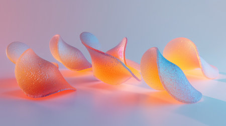 Holographic transparent glass 3d potato chips floating in the air on a white background.