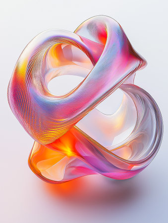 An abstract digital artwork presents a flowing, iridescent form against a solid black background. The piece showcases a blend of colors, with gradients and highlights creating a sense of depth and fluidity. The lighting appears soft and diffused. This image is suitable for various commercial uses, including website design and advertising.