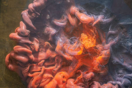Fume background. Mysterious alchemy. Purple orange glitter liquid spill.