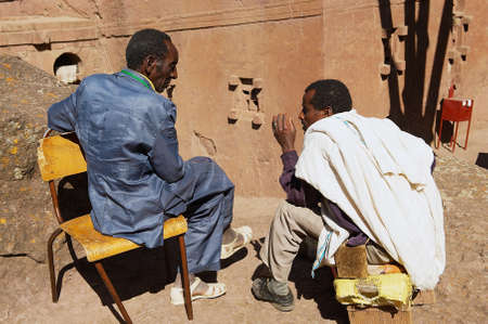 Lalibela, Ethiopia, January 27, 2010 - Pilgrims talk with the monolithic rock-hewn church at the background in Lalibela, Ethiopia.