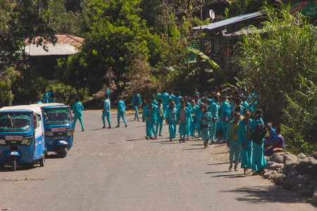 Mekele, Ethiopia - Nov 2018: Group of Ethiopian school kids wearing uniforms and walking on the local road