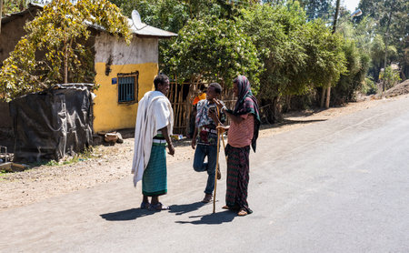 Gondar, Ethiopia - Feb 07, 2020: Ethiopian people on the road from Gondar to the Simien mountains, Noth Ethiopia, Africa.