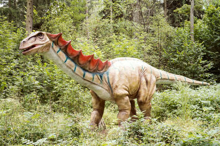 Big model of prehistoric dinosaur in nature. Realistic scenery.