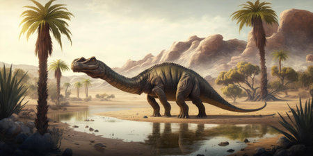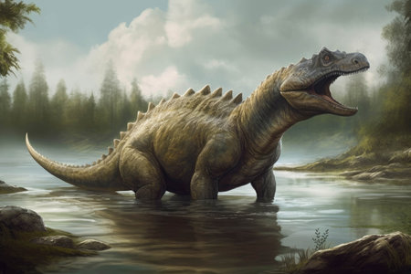 Prehistoric creature or dinosaur in the wild nature. Realistic style drawing. superlative generative AI image.