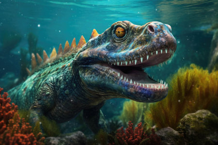 A curious water dinosaur examining a nearby reef its mouth agape in awe of the vibrant life within.. AI generation