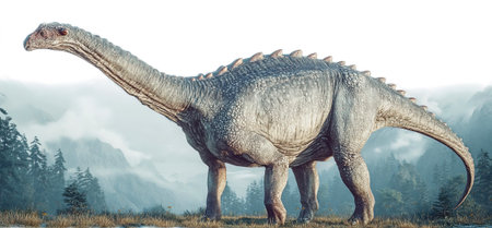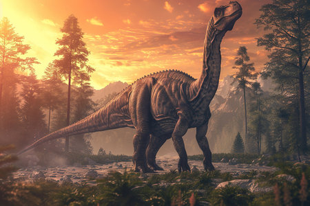 Astrodon a massive dinosaur stands majestically against a backdrop of towering mountains and dense forests. This prehistoric creature roams through a vibrant and untouched primeval environment.