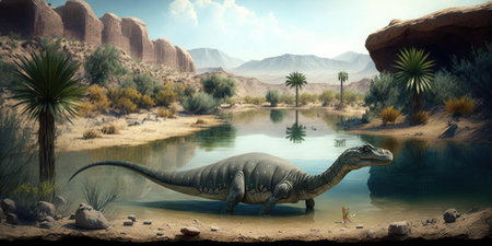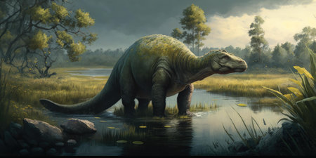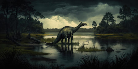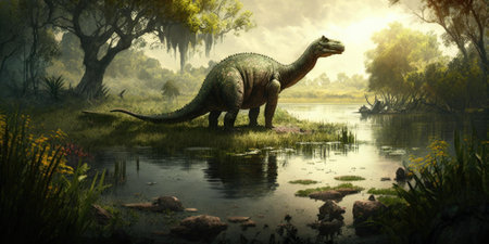 An enormous water dinosaur stretching its massive neck to its prey from the river.. AI generation