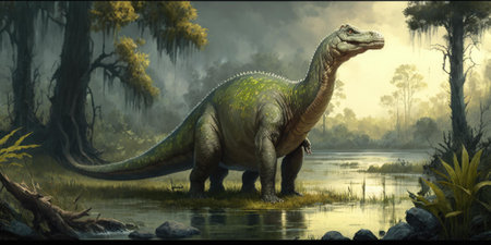 A Brachiosaurus dipping its long neck to browse treetops.. AI generation