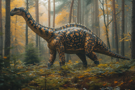 A large dinosaur is walking through a forest. Scene is peaceful and serene, as the dinosaur moves through the trees