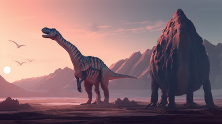 A couple of dinosaurs standing next to each other. Generative AI image.