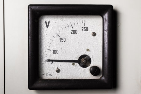 Old analog voltmeter with an arrow and cracked paint on a scale with numbers. Electrical measuring and control device