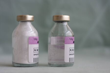 Two vials of antibiotics, in the one is powder, in the second is diluted solution., injection drugs used in treatment of patients with pneumonia caused by coronavirus covid 19.