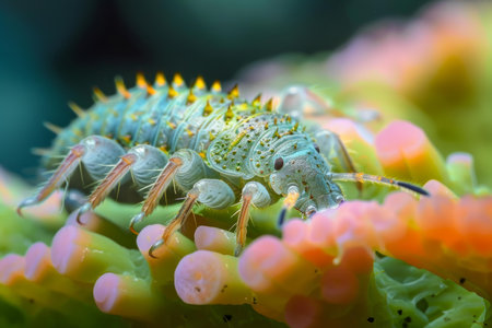 Closeup image displaying the vivid details and textures of a spiny caterpillar on colorful foliage