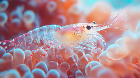 Macro shrimp on coral, translucent texture, marine life closeup
