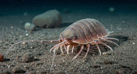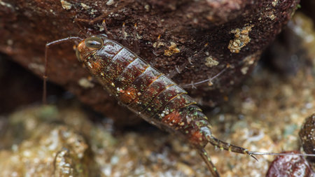 Close-up of a sea slater crawling on a rock, showcasing its segmented body and delicate legs, macro photography and don't have generated by AI.