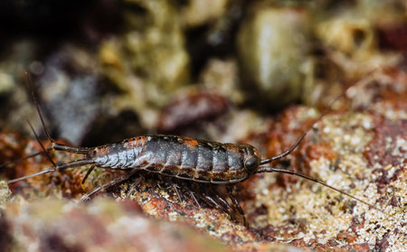 Close-up of a Sea Roach exploring the rocky surface of an intertidal zone, showcasing its segmented body and delicate antennae, macro photography and don't have generated by AI.
