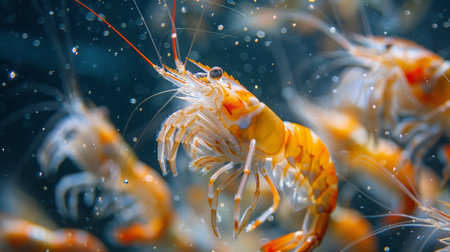 Shrimp Swimming Gracefully in Vibrant Ocean Waters Showcasing Their Colorful Features in a Lively Marine Habitat. Generative AI