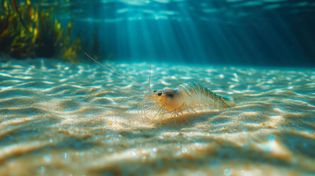Capture the serene beauty of an underwater shrimp gliding over a sandy ocean floor, illuminated by soft rays of sunlight. A masterpiece of marine life.