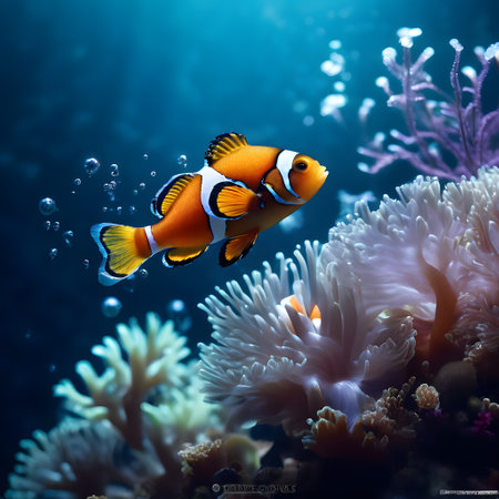 A vibrant clownfish swims gracefully among coral formations, representing the delicate balance of underwater ecosystems and the beauty of marine life.