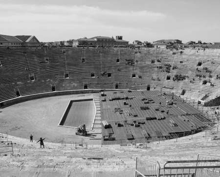 VERONA, ITALY - CIRCA MARCH 2019: Arena di Verona roman amphitheatre in black and white