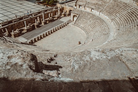 Aspendos Amphitheater close-up inside in the summertime with sunshine, Turkey, Serik district