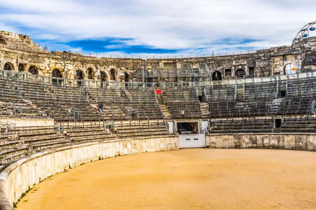 Ancient Classical Roman Amphitheatre Arena Floor Seats Ferris Wheel Nimes Gard France. Built in 70 AD Used now for bull fights and sports events