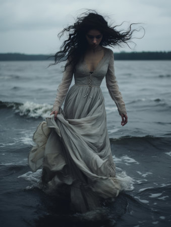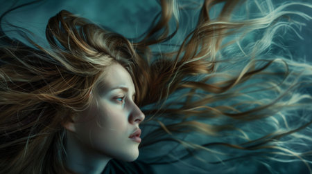 A close-up of a woman with long, flowing hair blowing in the wind, creating a dramatic and captivating visual effect.