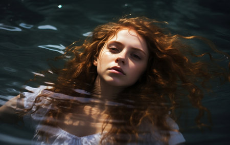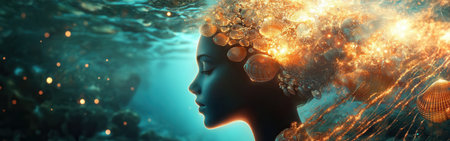 A woman glows ethereally as she appears submerged in an underwater realm. Surrounded by radiant light and sparkling elements, her serene expression captivates in this dreamlike setting.