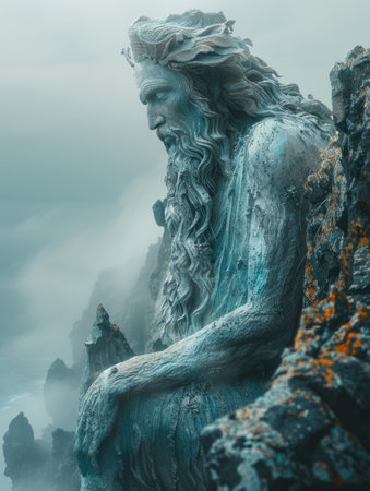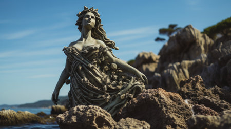 Classical siren statue singing enchantingly surrounded by crashing waves