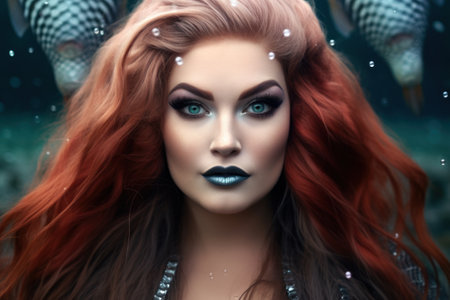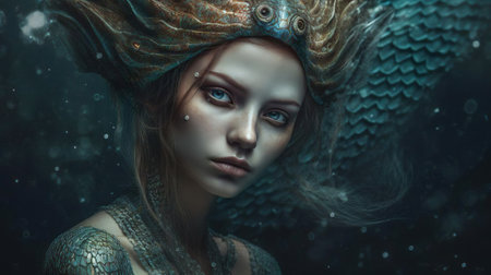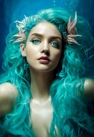 Portrait of a beautiful mermaid siren of the sea. The mermaid swimming underwater in the deep blue sea. Fantasy woman real mermaid. Myth mystic magic fairy tale concept.