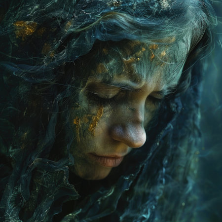 A woman with stunning, intricate curls features a captivating glow emanating from her hair. The soft, misty background enhances the mystical ambiance and her serene expression.