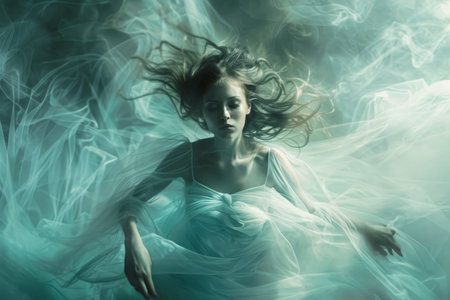 A woman wearing a blue dress is airborne, floating gracefully, Ethereal music floating through the air