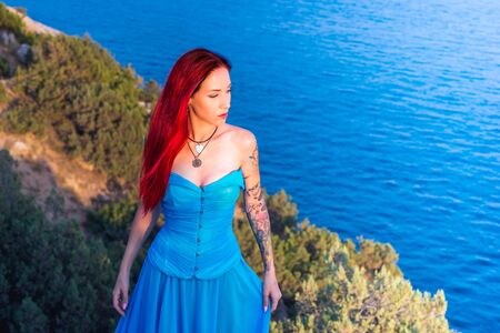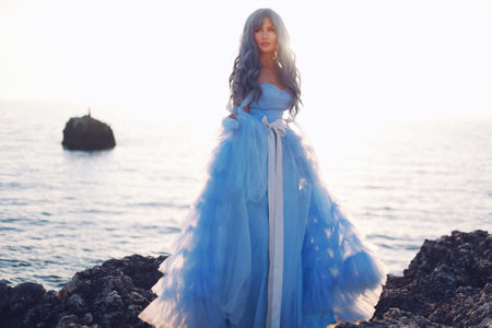 magical photo of a girl with blue hair in a blue dress against the backdrop of the sea. sea mermaid
