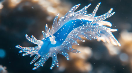 A stunning blue sea slug gracefully glides through a vibrant coral reef, showcasing the delicate beauty of marine life and the richness of underwater ecosystems.