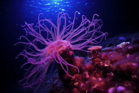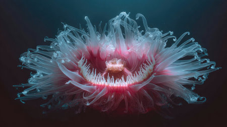 An image showcases a sea anemone in a close-up view against a dark backdrop. The aquatic plant is characterized by a translucent, radial arrangement of tentacles, exhibiting a range of blue and white hues. The composition may be suitable for scientific illustrations, educational resources, or artistic designs.