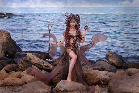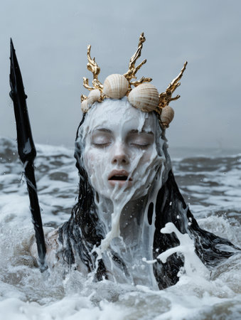 Portrait of a young woman with freckles and a seashell crown, partially submerged in water, holding a trident.