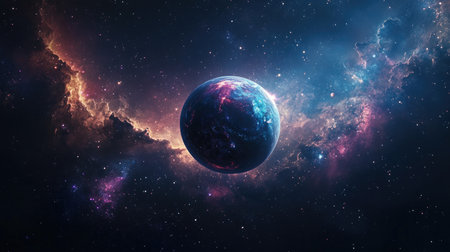 This stunning image captures a vivid cosmic scene featuring a planet surrounded by vibrant nebula and countless stars, evoking a sense of wonder.