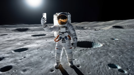 Astronaut is taking a selfie on the moon surface, with a desolate lunar landscape in the background.