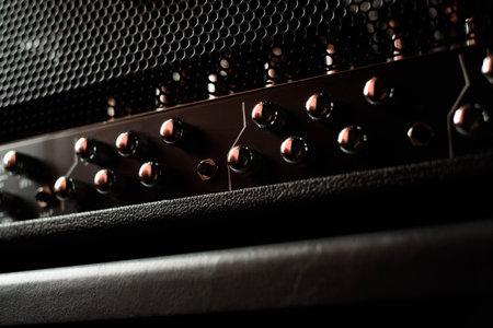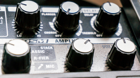 Guitar amplifier, level knobs closeup shot. Electric guitar amp closeup photo for rock music.