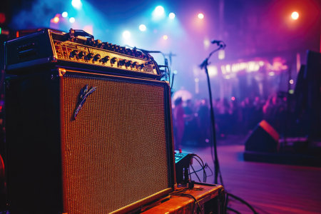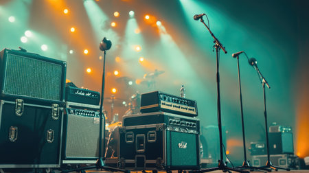Captivating scene featuring amplifiers and microphones set up on stage, illuminated by vibrant lights, ready for an energetic live music performance.