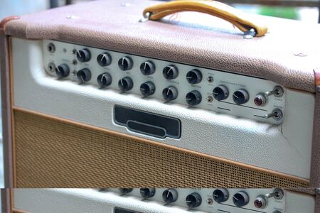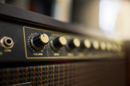 Vintage guitar amplifier closeup,focus on volume knob, for music,sound,entertainment themes