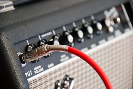 macro closeup of a guitar cable plugged into the amplifier, professional music equipment